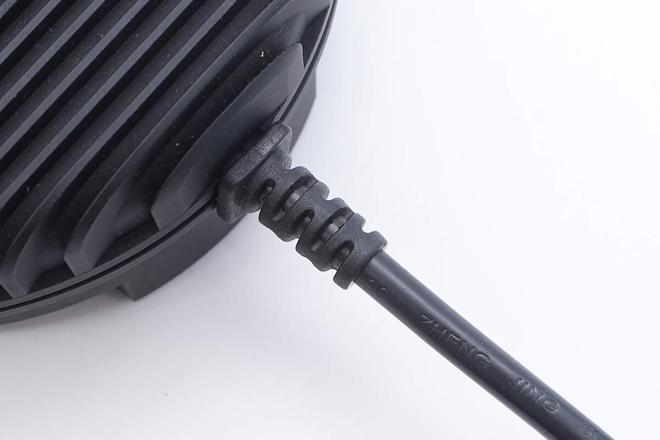 无线充电接收模块特写,为圆形设计,机身侧面设有输出线。无线充电接收模块采用塑料材质外壳,上方设有指示灯,中间位置设有散热片为接收器散热。