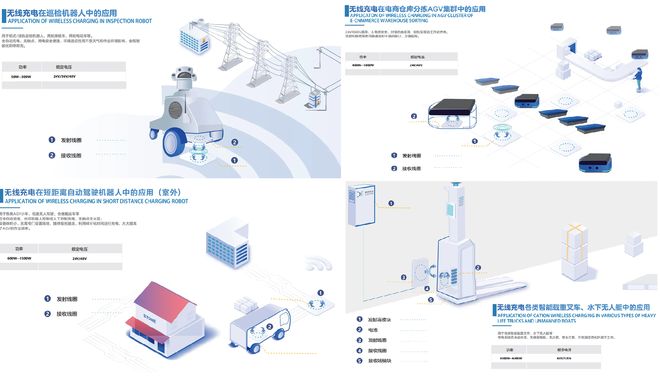 无线充电设备支持宽工作范围温度和高防护等级,并具备完善的保护功能,支持过流、过压、过温、反极、短路和开路保护,支持30mm无线mm偏移范围,适合为地面巡检机器人、轨道机器人、巡检无人机、AGV、物流机器人、服务机器人、军用机器人、水下机器人、扫地机器人等充电。